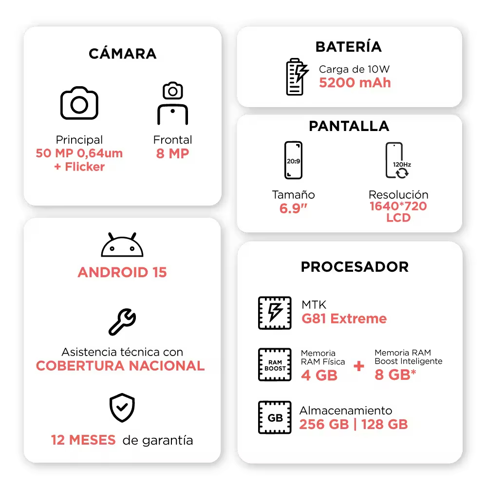 Memoria RAM: 4 GB (física) + hasta 8 GB (RAM Boost) con elección automática a través de IA